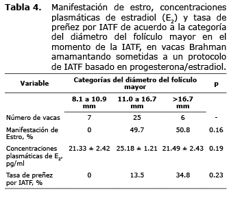 No se encontró asociación significativa entre el diámetro del folículo mayor y las concentraciones plasmáticas de E2 (Tabla 2), en el momento de la IATF (p>0.05). La categoría del diámetro del folículo mayor (Tabla 4) no influenció las concentraciones plasmáticas de E2 (p>0.05).