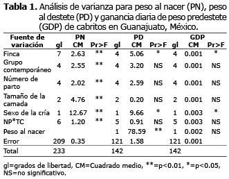Análisis estadístico. Los datos fueron analizados usando el procedimiento de modelos lineales generales (5) que consideró los efectos de finca, grupo contemporáneo (GC), número de parto, tipo de parto, sexo del cabrito y sus interacciones, mediante el siguiente modelo estadístico: