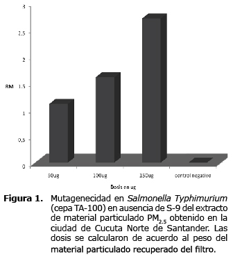 Detección de la actividad mutagénica. El efecto mutagénico de los extractos del PM2.5 del aire de Cúcuta, se determinó por medio del test de Ames, usando el protocolo descrito por Maron y Ames (25). En esta prueba el indicativo de la mutación está dado por la reversión his- a his+, las revertantes se identifican porque crecen en medio mínimo sin histidina. Se trabajó con una cepa de Salmonella typhimurium cepa TA 100 en la cual se produce la reversión por sustitución de un par de bases. Con cada muestra se trataron 107 UFC, se utilizaron controles positivos y negativos. Para el control positivo se utilizó 4-nitroquinolina óxido (4-NQO). Como control negativo se usó DMSO al 12%. Se catalogó como respuesta positiva, los resultados que presentaron un incremento significativo de revertantes con relación al control negativo y este resultado fue reproducible. Para realizar los análisis mutagénicos y genotóxicos se evaluaron tres concentraciones de material particulado (50 µg, 100 µg y 150 µg). Para verificar la reproducibilidad de los resultados se realizaron tres experimentos independientes, cada uno por duplicado.