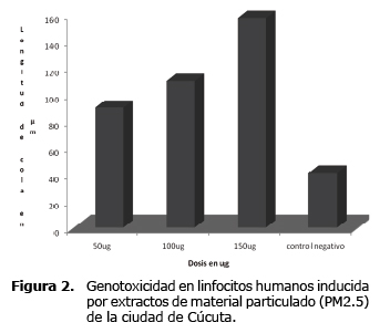 Como se observa en la tabla 2, a medida que se incrementa la concentración de extracto, el tipo de daño se va incrementando hasta llegar a un daño alto como es el caso de la dosis de 150 µg, en la cual el 83% de las células muestran daño alto, el 12% daño medio y el 5% daño bajo. También se observa en la tabla 2 y en la figura 2 que las concentraciones que indujeron mayor frecuencia de células con daño en el ADN, también mostraron mayor longitud de migración del ADN (cola). Esto podría indicar que los genotóxicos que producen más daño en el ADN, también afectan más número de células. En la tabla 2 y en figura 2 se observa que todas las dosis de PM2.5 analizadas producen daño significativo en el ADN de linfocitos humanos p≤0.05. Esto indica que la mayoría de los mutágenos que llegan a la población en las partículas del aire pueden penetrar hasta el núcleo de células humanas y dañar su ADN. A pesar del uso de células humanas en ensayos in vitro, no se puede dar una respuesta definitiva sobre la carcinogenicidad del PM2.5 para humanos. La extrapolación de los resultados puede conducir a la hipótesis sobre el riesgo de la exposición a la contaminación del aire, dado que en el presente estudio se mostró que el PM2.5 causa mutagenicidad y genotoxicidad. Estos resultados concuerdan con estudios hechos por otros autores (22,23,30).