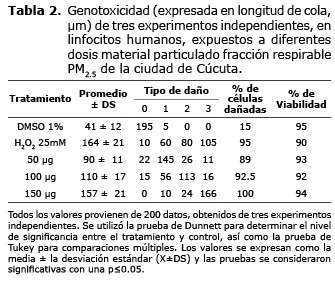 Mediante el ensayo cometa se analizó el daño inducido en el ADN por extractos del material particulado PM2.5 de la ciudad de Cúcuta a un total de 200 células por tratamiento en tres experimentos independientes. El indicativo del daño genotóxico en cada célula es la ruptura de su ADN, la cual se manifiesta como un cometa, de tal manera que a mayor daño, la longitud de la cola del cometa será mayor. Para mostrar que el daño en el ADN en las células, es debido al tratamiento y no a factores que conducen a la muerte celular, se determinó la viabilidad celular después del tratamiento y se encontró que siempre ésta se mantenía por encima del 90%. Como se puede observar en la tabla 2 y en la figura 2, las células que muestran daño espontáneo, no superan una longitud de cola de 41 µm y la mayoría de células (97.5%) están en el rango 0, mostrando que la mayoría de células no tiene daño o muestran algo de daño, pero muy bajo, solamente el 2.5% de las células mostraron daño tipo 1 y ninguna de las células mostraron daño 2 ó 3. De igual manera con la dosis de 50 µg de PM 2.5 se pudo observar que el 72.5% de las células tienen daño tipo 1, 13% daño tipo 2 y 5.5% daño tipo 3.