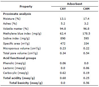 Table 1 shows the physicochemical characteristics of activated carbons CAY and CAM. From the proximate analysis it is observed that the humidity percentage and volatile material it less for the activated carbon prepared from manioc husk than for the commercial carbon brand. On the other side, the content of ashes although low for both activated carbons is slightly higher for CAY. It is suggested that the higher percentage of humidity of the activated carbon CAM (17.4%), is mainly due to its environmental and storage conditions, because as a solid porous adsorbent it retains air humidity on its surface. With respect to the properties of texture: specific area, volume of micropores and total volume of pores, these were calculated from the iodine index and methylene blue index. The iodine index value expresses the amount of iodine adsorption in an aqueous solution, is a measure of micropores and is used as an estimate of the total surface area. Adsorbents with high iodine index show a better performance in the elimination of contaminants of small size, whereas, the methylene blue index shows larger pore sizes developed during activation. It is important to note that for the calculation of the iodine value, samples of 1.2 g of CAY and 1.8 g of CAM were taken, so that the tabulated correction factor of the iodine index would be adjusted to each carbon sample analyzed. In table 1 it is observed that the CAY activated carbon was able to develop a higher specific area (472 m2/g) with the predominance of micropores that favor the adsorption process. About the bigger pores size estimation, the methylene blue index shows that the CAM carbon, with 178.5 mg/g, has more macro and mesoporous structures.