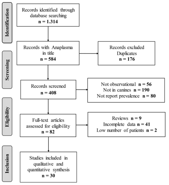 Screening. According to the criteria applied, the title/ abstract of the articles included the search terms and were observational studies of prevalence, with canines as the main population and with an explicit report of the prevalence, that is, population and number of positives. Neither time nor selection restrictions were established for the search. As the first study found was published in 2001 and the search protocol was last updated in April 2018, the period between 2000 and 2018 was accordingly established as the time window for this study. Some syntax used in the search and selection were: (Anaplasma[Title]) AND Prevalence[Title/Abstract], (Anaplasmosis[Title]) AND Ocurrence[Title/Abstract], (ti: (anaplasma)) AND (ab: (prevalencia)).