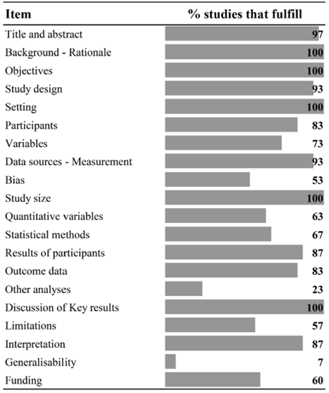 The studies showed a good methodological quality after meeting 70% or more of the criteria specified in the STROBE guide. However, the compliance of some criteria, such as those related to the control of selection and data biases, the performance of additional analyses exploring associated factors, and the discussion of possible generalizations of results, was not very explicit (Figure 2).