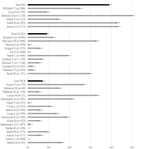 Se incluyeron 30 estudios con 18.472 caninos, la mayoría de Brasil, Estados Unidos y Alemania. En IFI se halló una prevalencia de 39.0% (IC95%= 37.0-41.0), en ELISA 9.3% (IC95%= 8.8-9.8) y en PCR 7.1% (IC95% = 6.4-7.8). La prevalencia basada en PCR fue estadísticamente mayor en América con 11.9% (IC95% = 10.5-13.3) frente a África con 5.5% (IC95% = 1.2-9.7), Asia 4.1% (IC95% = 3.1-5.1) y Europa 3.5% (IC95% = 2.5-4.5). La prevalencia de A. platys con PCR fue 16.1% (IC95% = 14.2-17.9) y de A. phagocytophilum 3.7% (IC95%= 2.8-4.6).