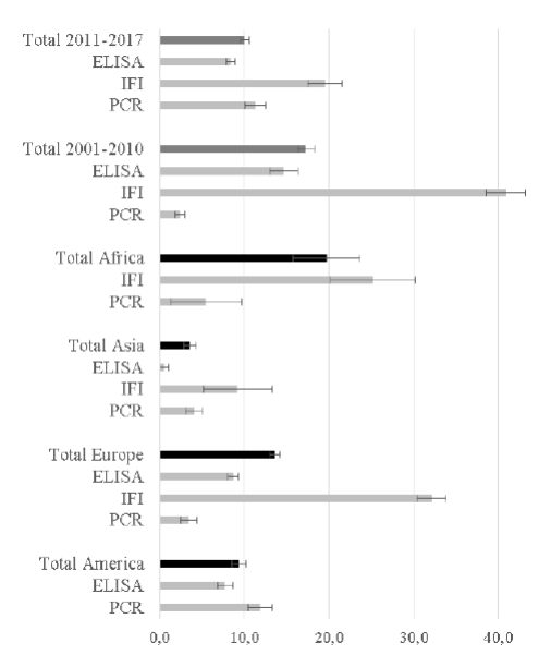 The systematic review was conducted in a population of 18,472 canines with 70.7% (n = 13.067) between 2011 and 2017.Regarding the location, 55.4% were (n = 10.237) in Europe; 29.5% (n = 5.442) in the American continent; 13.0% (n=2.397) in Asia; and 2.1% (n=396) in Africa. From such population, 65.2% (n=12.044) of the canines were screened or diagnosed with ELISA; 30.1% (n = 5.554) with PCR; and 13.3% (n = 2.453) with IFI (Table 1).