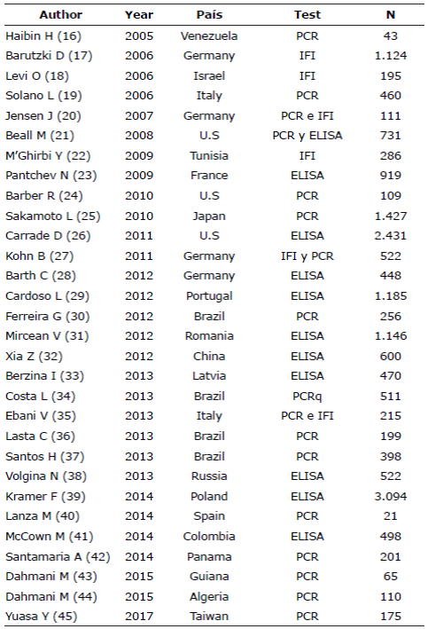 The studies were published between 2005 and 2017 with a higher proportion of publications as of 2011 with 66.7% (n = 20). Out of the total of studies, 43.3% (n = 13) was carried out in European countries; 36.7% (n = 11) in the American continent; 13.3% (n = 4) in Asia; and 6.7% in Africa (n = 2). The countries with the highest number of studies were Brazil, the United States, and Germany. PCR was reported to have been used in 56.6% (n = 17) of the studies; ELISA in 36.6% (n = 11); and IFI in 20.0% (n = 6). PCR and ELISA were used simultaneously in one study; PCR and IFI in three of them (Table 1).