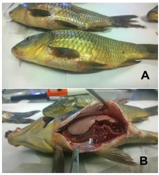 Figura 1 Carpas comunes con infección natural con SVCV. Superficie corporal externa sin lesiones aparentes (1A). A la necropsia se observaron adherencias entre órganos internos y entre órganos con pared abdominal (1B).