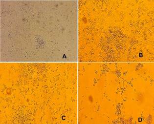 Figura 2 Células EPC infectadas con SVCV en dilución 1:10 e incubadas a 25°C. Células sin infección (A); células incubadas a 25°C con CPE a 48 hpi (B), células incubadas a 20°C con CPE a 72 hpi (C); destrucción final de la monocapa de células (D)