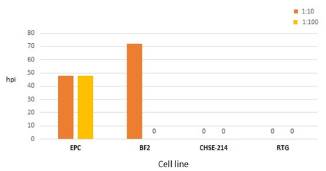 Replicación de SVCV en diferentes líneas celulares. El sobrenadante del aislamiento primario se cosechó y se realizaron diluciones 1:10 y 1:100, de las que 100 μL se inocularon en monocapas de células EPC (epithelioma papulosum cyprini), BF-2 (Bluegill fry - Lepomis macrochirus), CHSE-214 (Chinook salmon embryo) y RTG-2 (rainbow trout gonad) y se incubaron a 20°C durante 7 días para determinar en cuáles células hubo multiplicación del virus.