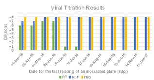 Continuando con lo anterior, el virus conservado en refrigeración y a -80°C prácticamente conservó el mismo título durante los 11 meses. En este sentido, la literatura describe que el virus puede guardarse congelado a -30 o -74°C durante más de seis meses con poca pérdida de título si el medio contiene 2-5% de SFB 1,2. Sin embargo, en el estudio no se evaluó el posible efecto del SFB.