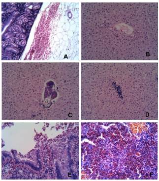 Figura 5 Lesiones histológicas en carpa común infectada por SVCV. Riñón: infiltración intersticial, hemorragia peritoneal y esteatitis, proliferación de melanomacrofagos 100x (A); Hígado: degeneración de paredes vasculares, degeneración y necrosis multifocal 250x (B); Peripancreatitis mononuclear y pancreatitis necrótica (C); infiltración linfocítica multifocal (D); Intestino: criptitis necrótica, enteritis hemorragica ulcerativa 250x (E); Bazo: congestión y hemosiderosis multifocal 250x (F)