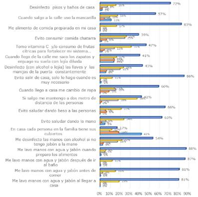 En la Figura 1, se muestran las prácticas preventivas frente a la pandemia del COVID-19 en los ciudadanos de Trujillo-Perú, y se puede observar que predomina lavarse frecuentemente las manos cuando se prepara los alimentos (88%) y después de ir al baño (87%), evitar salir de casa (86%) y alimentarse de comida preparada en casa (83%). Sin embargo es importante mencionar que un 42% de personas manifestaron que nunca separan cubiertos para comer, 14% nunca limpian la suela de su zapato cuando llegan a la casa, y un 11% que no usan mascarilla al salir a la calle.