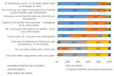 En la Figura 2 encontramos las actitudes frente a la pandemia del COVID-19 en los ciudadanos de Trujillo, y se puede observar que la mayoría de encuestados (94%) manifestaron estar de acuerdo con el aislamiento social, considerando que es la mejor opción para no propagar el virus, se encuentran preocupados que algún integrante de la familia pueda contraer el virus (90%), sin embargo un 7% de ciudadanos opinaron que se está exagerando, que la enfermedad pasará y un 22% cree que simplemente es una gripe fuerte con cura.