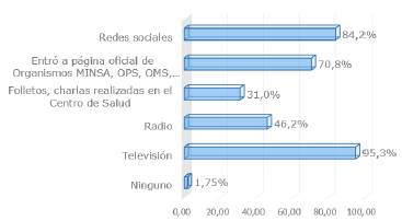En la Figura 3 se puede apreciar que el 95.3% de pobladores refiere que el medio de comunicación que brinda mayor información sobre el COVID-19 a los ciudadanos de Trujillo es la televisión, sin embargo también existe un 1.75% de personas que no les interesa informarse por ningún medio.