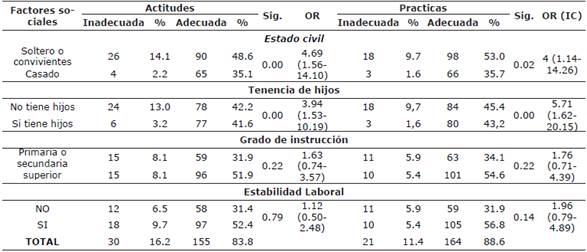 Al analizar los factores sociales, se observó que la mayoría de ciudadanos encuestados que tienen actitudes y practicas adecuadas, son solteros o convivientes (48.6 y 53% respectivamente), no tienen hijos (42.2 y 45.4% respectivamente) , tienen estudios superiores (51.9 y 54.6% respectivamente), estabilidad laboral (52.4 y 56.8% respectivamente), sin embargo también existe un porcentaje significativo de ciudadanos que tienen actitudes y prácticas inadecuadas, son solteros o convivientes (14.1 y 18% respectivamente) y no tienen hijos (13 y 9.7% respectivamente). Por ultimo también en el análisis se puede apreciar que existe asociación entre el estado civil y el tener hijos con las actitudes y prácticas preventivas frente al COVID-19 (p<0.05), así como que existe 4.69 veces mayor probabilidad de que una persona soltera tenga una actitud inadecuada y 4 veces mayor probabilidad que tenga también practicas inadecuadas, así como que una persona que no tiene hijos tiene 3.94 veces mayor probabilidad de tener actitudes inadecuadas y 5.71 veces mayor probabilidad de tener practicas preventivas inadecuadas frente a la pandemia del COVID-19. (Tabla 2).