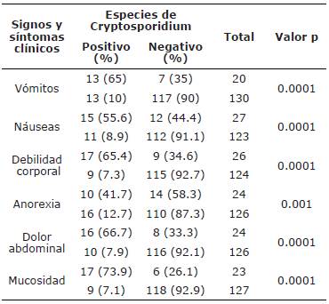 Tabla 2 Relación entre la prevalencia de las especies de Cryptosporidium y algunos síntomas clínicos.