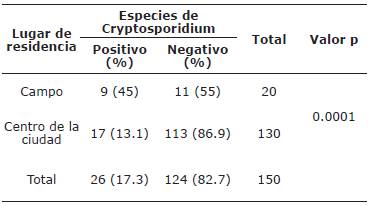 Tabla 3 Evaluación de la prevalencia de especies de Cryptosporidium según el lugar de residencia de los individuos.