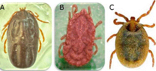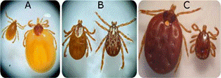 Figura 2. Garrapatas transmisoras de patógenos a los humanos. 2A) Macho y hembra de Ixodes scapularis. 2B) Macho y hembra de Dermacentor variabilis. 2C) Macho y hembra de Amblyomma americanum. Imágenes proporcionadas por el Dr. Francisco Martínez-Ibañez.