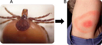 Figura 3 Enfermedad de Lyme. 3A) Garrapata Ixodes scapularis (Imagen proporcionada por el Dr. Francisco Martínez-Ibañez). 3B) Eritema crónico migratorio (Imagen proporcionada por el Dr. Luis Tinoco García).