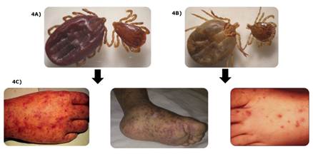 Figura 4. Enfermedad Fiebre manchada de las Montañas Rocosas. 4A) Macho y hembra de R. sanguineus y 4B) Macho y hembra de A. mixtum (Imágenes proporcionadas por el Dr. Francisco Martínez-Ibañez). 4C) Exantema eritematoso y macular en humanos (Imágenes proporcionadas por el Dr. Luis Tinoco García y Dr. Gerardo Álvarez-Hernández).
