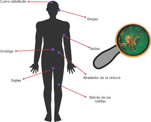 Figura 5. Zonas del cuerpo humano donde es frecuente la localización de garrapatas. (Imagen elaborada por el Dr. Rodolfo Lagunes-Quintanilla y la Mtra. Nancy Mendoza-Martínez).