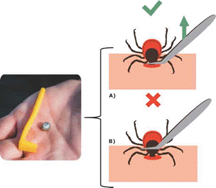 Cuando se llegan a encontrar garrapatas en el cuerpo, se deben retirar a la brevedad, evitando dejar el aparato bucal incrustado. Este proceso se realiza mediante pinzas de punta fina, tomándola lo más cercano al aparato bucal y levantando en posición vertical tirando de ésta. Actualmente, en el mercado se venden pinzas especiales para la extracción de garrapatas que pueden utilizarse en humanos y en animales de compañía (Figura 6). Una vez retirada la garrapata es conveniente resguardarla en un recipiente o frasco con la finalidad de que, si la persona presenta sintomatología en los días posteriores, el ejemplar pueda utilizarse para identificación taxonómica y para realizar un diagnóstico definitivo, ayudando a prescribir un tratamiento oportuno y certero 12,49.