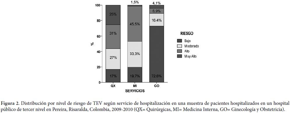La muestra de este estudio, estuvo dividida en forma similar en cuanto a los tres servicios y también desde el punto de vista de sus variables socio-demográficas, excepto por el hecho de que por las características del hospital, la mayoría de pacientes eran de estratos socio-económicos 1, 2 y 3. Por ser este un hospital público atiende los estratos de menores recursos económicos. Esta clasificación está estandarizada en Colombia de acuerdo con clasificación de los inmuebles residenciales que deben recibir servicios públicos. Se realiza principalmente para cobrar de manera diferencial (por estratos) los servicios públicos domiciliarios permitiendo asignar subsidios y cobrar contribuciones. Se estratificó con base en las características de las viviendas y su entorno urbano o rural, ya que es una opción metodológica fundamentada en que el significante vivienda-entorno expresa un modo socioeconómico de vida y para permitir comparaciones con otros estudios o muestras diferentes. La muestra por ser institucional, no es representativa de la población general y los hallazgos de este estudio solamente son aplicables a este hospital y reflejan específicamente lo que sucede en este. Sin embargo, se quiso identificar la prevalencia de DVC en pacientes hospitalizados como factor de riesgo de TEV y es preciso aclarar que de acuerdo con la última actualización de la epidemiología de los DVC (20) el nivel socio-económico no ha sido identificado como un factor significativo para presentar o no la enfermedad. Entonces, el hecho de que este hospital atienda las poblaciones más pobres de la región, no estaría sesgando los resultados en términos de la prevalencia de los DVC en pacientes hospitalizados y mucho menos como factor de riesgo de TEV, ya que la frecuencia de presentación del mismo, depende de factores ya expresados entre los que no está el nivel socio-económico. En teoría, que la muestra no incluya pacientes de los estratos sociales más altos, no tendría por qué sesgar la categorización de riesgo, aunque se deja en claro que la conducta o adherencia a las guías si puede variar considerablemente de una institución a otra, o entre una institución pública y una privada, pues en Colombia, según el sistema único de acreditación en salud, que garantiza la calidad de atención en salud de las instituciones, solamente 8 instituciones públicas están acreditadas (un 30% de las instituciones acreditadas en salud) (21).