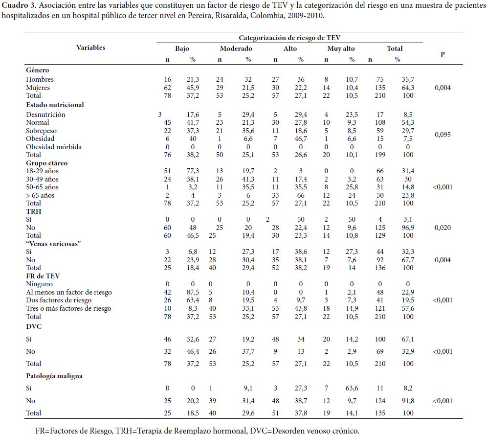 Adicionalmente, existe la percepción de que, entre los factores de riesgo de TEV, la presencia de DVC, es difícil de identificar o no se detecta. La dificultad radica en que muchos de estos pacientes están confinados a una cama, no pueden adoptar una posición ortostática para ser examinados y puede haber un subregistro en el diagnóstico de DVC por no detectarse la enfermedad en posición decúbito supino. Por ello, el particular interés en evaluar la prevalencia de DVC en pacientes hospitalizados, como un factor de riesgo a tener en cuenta al momento de categorizar al paciente según el riesgo de presentar TEV y de tomar decisiones en cuanto a la profilaxis farmacológica. En los estudios publicados sobre el tema, se clasifican los pacientes de acuerdo a los factores de riesgo más sobresalientes, pero no se tienen en cuenta la totalidad de factores de riesgo para esta clasificación. Los modelos de evaluación formal del riesgo tampoco han sido adecuadamente validados y hay poco entendimiento sobre la manera como los factores de riesgo interactúan entre si de una forma cuantitativa que permita definir la posición del paciente a lo largo de un espectro continuo de riesgo de TEV (17). Sin embargo, al investigar sobre el tema, todos los factores que se han identificado como riesgo de TEV, deben ser evaluados; de otra manera, la clasificación de riesgo puede tener sesgos importantes. Se tuvo especial cuidado en incluir la totalidad de los factores de riesgo identificados en diversos estudios previos, al momento de clasificar el paciente.