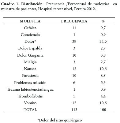 Se incluyeron pacientes operados por cirugía electiva o de urgencias, mayores de 18 años y de nacionalidad colombiana. Se excluyeron pacientes con limitaciones cognitivas que dificulten el desarrollo de la entrevista; pacientes con deficiencia auditiva; pacientes que se negaron o que estaban imposibilitados de participar en el estudio. A los pacientes elegidos se les evaluó las primeras 48 horas del post operatorio. Previo consentimiento informado, se utilizó un instrumento previamente validado (7), facilitado por los autores, La información se recolectó por medio de una encuesta personal y se revisaron las historias clínicas con el fin de determinar la prevalencia de complicaciones menores debido a la anestesia y la valoración del manejo del dolor de los pacientes).