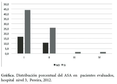 La prevalencia de complicaciones anestésicas menores relacionadas con el tipo de especialidad quirúrgica tuvo un comportamiento similar para cada una de las especialidades, situación igualmente observada cuando se relaciono la prevalencia de complicaciones anestésicas menores con el tipo de cirugía electiva o urgencia mostrando un comportamiento similar para cada variable, 34,8% y 37,9% respectivamente. En relación con el ASA y la presencia de CAM se muestra en la siguiente gráfica (Gráfica).
