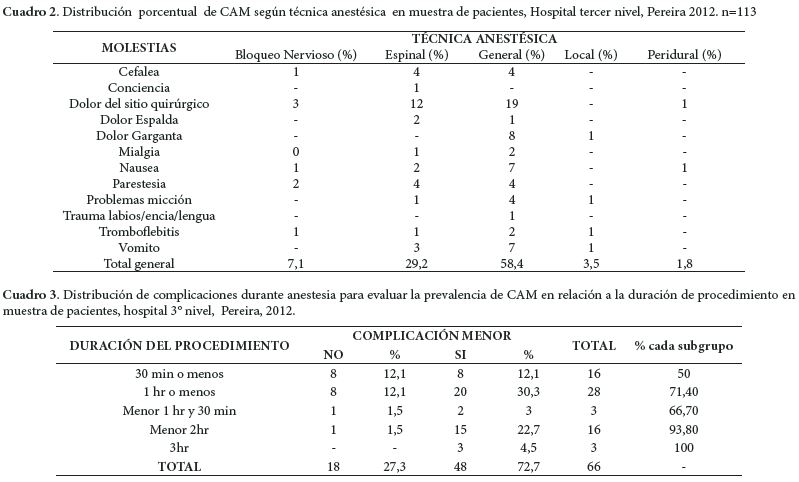 Un total de 48 pacientes (73%) presentaron complicaciones anestésicas menores durante el periodo post-operatorio, 19 pacientes (39,6%) presentaron una complicación, 10 pacientes (20,8%) dos complicaciones, 7 pacientes (14,6%) 3 complicaciones, 7 pacientes (14,6%) 4 complicaciones y 5 pacientes (10,4%) presentaron 5 complicaciones. Las complicaciones anestésicas con más prevalencia fueron: dolor del sitio operatorio 39 pacientes (34,5%), nauseas 12 pacientes (10,6%) y vomito 12 pacientes (10,6%) (Cuadro 1), las mujeres presentaron una prevalencia de complicaciones del (75,8%), mientras que los hombres presentaron una prevalencia de (70,3%), en cuanto al rango de edad los pacientes entre 18-33 años (75,9%) presentaron complicaciones menores, entre 34-49 años (63,2%), entre 50-65 años (85,7%) y >65 años (72,7%) presentaron complicaciones anestésicas menores.
