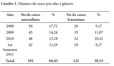 Se realizó un estudio de 316 expedientes clínicos de pacientes con diagnóstico de intoxicación aguda. En el Cuadro 1, se muestras la distribución por sexo, durante el periodo de estudio.