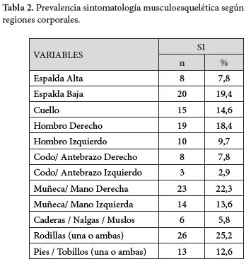 En los operarios encuestados en el presente estudio, la zona de mayor prevalencia de sintomatología fue rodillas (25,2%), mientras estudios en personal de salud registran para el cuello la mayor prevalencia de síntomas [13]. Por otra parte, en el estudio de Sierra y Pardo en operarios de una pasteurizadora de leche mostró para mano y muñeca la mayor prevalencia de molestias (88,9%) y para cuello la menor prevalencia con un 16,7%, registro cercano al 14,6% hallado en esta investigación para este mismo segmento corporal.