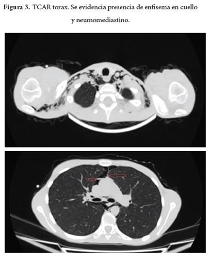 Al día siguiente de su ingreso presenta dolor cervical, sin disnea ni dolor torácico y se advierte presencia de enfisema subcutáneo en cuello y parte superior del tórax con evidencia de enfisema subcutáneo en radiografía de tórax (Figura 1 y 2) y se indica TCAR de tórax (Figura 3) en el cual se halla pneumomediastino sin pneumotórax. La paciente presenta durante días posteriores persistencia de cervicalgia y además asocia dolor torácico, sin disnea ni deterioro del patrón respiratorio ni alteración de las constantes vitales, como dato relevante al examen físico se advierte el signo de Hamman a la auscultación cardiaca. Se le realizan estudios de extensión en busca de la etiología del pneumomediastino con endoscopia de vías digestivas altas que reporta gastropatía eritematosa antrocorporal y fibrobroncoscopia con reporte normal.