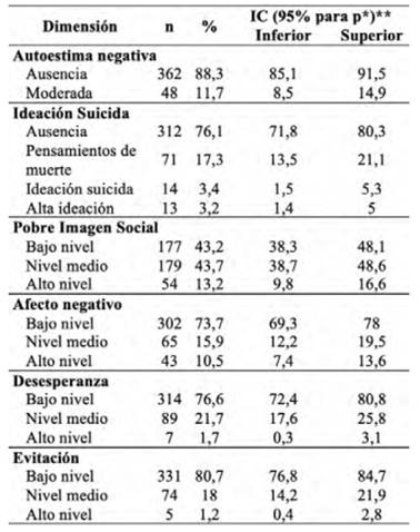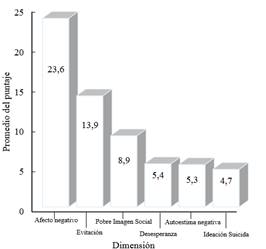 Cuando se consideraron los puntajes promedio obtenidos en cada una de las dimensiones, el correspondiente al afecto negativo fue el que sobresalió (promedio=23,6 puntos DE=8,0 puntos) seguido por los puntajes promedio de evitación (Promedio=13,9 puntos DE=3,8 puntos) y pobre imagen social (Promedio=8,9 puntos DE=3,3 puntos). Las menores puntuaciones promedio se obtuvieron en las dimensiones de autoimagen negativa (Promedio=5,3 puntos DE=2,1 puntos) e ideación suicida (Promedio=4,7 puntos DE=1,8 puntos) respectivamente. Figura 1: