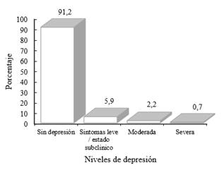 Según las condiciones de interpretación del CDH, la prevalencia de depresión en los soldados regulares fue del 8,8% (IC 95: 5,9% 11,6%). De todos los niveles de depresión, fue más prevalente el de síntomas leves/estado subclínico con el 5,9% (IC 95%: 3,5% 6,2%). En general, por cada soldado con depresión severa, se presentaron aproximadamente 125 sin depresión: