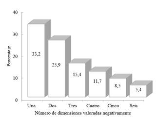 Para cada una de las dimensiones, se consideraron las categorías que expresaban una valoración negativa. Especificamente, para la autoestima negativa se seleccionó la categoría moderada. Para la ideación suicida, las categorías pensamientos de muerte, ideación suicida y alta ideación, las cuales se agruparon en una que refiriera algún asomo de ideación suicida y así sucesivamente. Se hizo con el fin de mostrar la distribución del número de dimensiones en las cuales los soldados reflejaron problemáticas. Se encontró que el 33,2% de los soldados (136) tuvieron puntuaciones que indicaban situaciones anómalas en una de las dimensiones seguida del 25,9% (106 soldados) cuyas puntuaciones reflejaron situaciones problemáticas en dos dimensiones; en el 86,1% tuvieron puntuaciones negativas en máximo cuatro dimensiones y el 5,4% en todas: