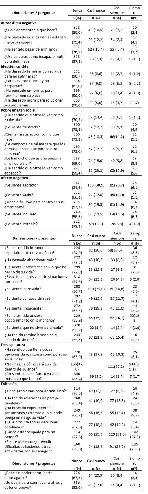 En general, las preguntas que constituyen cada uno de los dominios del instrumento que miden la depresión, están formuladas en sentido negativo con respuestas en escala tipo Likert (Nunca, Casi nunca, Casi siempre y Siempre). Se observó que en las respuestas a todos los interrogantes las frecuencias predominantes fueron entre nunca y casi nunca, aunque, en particular, se observaron frecuencias de respuestas que llamaron la atención: cuando se indagó acerca de la autoimagen negativa que tenían los soldados con base en las preguntas para tal fin del instrumento, se destacó que el 12,4% pensaban que los demás estaban mejor sin ellos; en la valoración de la ideación suicida el 9% respondió que entre casi siempre o siempre fantasea con dormir y no despertar; en lo que se relaciona con la valoración que hicieron los soldados de la imagen social, llamó la atención que casi siempre o siempre el 21,5% y 16,3% han sentido que otros los ven como apagados y que se sienten insatisfechos con lo que hacían, respectivamente; en la dimensión afecto negativo, se resaltó que la ansiedad, el agotamiento y la intranquilidad tuvieron frecuencias de presentación importantes (con respuestas de casi siempre y siempre en el 28,3%, 26,8% y 25,2%, en ese orden). En general, con respecto a la dimensión de desesperanza, el 42,2% no imagina cómo será su vida dentro de 10 años; en las respuestas de los soldados en el tópico relacionado con la evitación, el 56,4% entre casi siempre y siempre refirió que buscaba estar ocupado para no pensar. De igual manera, el 47,8% respondió que es mejor evadir dificultades haciendo otras actividades con sus amigos: