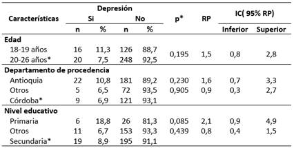 Cuando se consideró la distribución conjunta de cada una las características de interés de los soldados regulares, descritas anteriormente, con respecto a la depresión, se encontró que esta fue más prevalente en los soldados regulares que tenía entre 18 y 19 años, con una oportunidad estimada de la presentación de la misma de 1,5 veces con respecto a los soldados que tenían entre 20 y 26 años, aunque las diferencias no fueron significativas. De igual manera, la prevalencia de depresión fue mayor en los soldados que provenían del departamento de Antioquia, en relación con los que tenían su asiento en el departamento de Córdoba o en otros departamentos, aunque la diferencia no tuvo significación estadística. Con respecto al nivel educativo, la prevalencia mayor de depresión se conoció en los soldados regulares que tenían como máximo nivel educativo la básica primaria, aunque las diferencias no fueron significativas con respeto los soldados que tenían estudios secundarios: