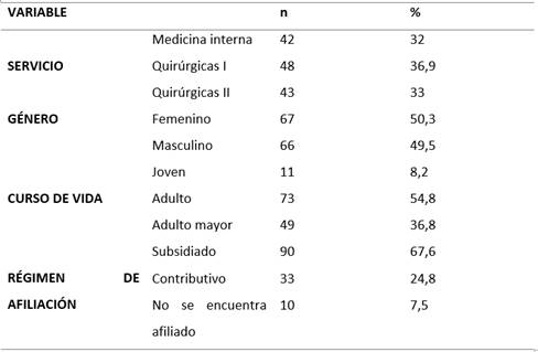 Para la selección de casos, se tuvo en cuenta el reporte de egresos entre los meses de agosto a diciembre del año 2016 del Hospital San José obteniendo una muestra para el estudio de 133 pacientes. Según la fijación proporcional por egreso, se determinaron 96 pacientes para el servicio de quirúrgicas y los 37 restantes al servicio de medicina interna. Como criterios de inclusión se consideraron: a) todos aquellos pacientes mayores de 18 años, que aceptaron participar voluntariamente en la investigación y firmaron el consentimiento informado, b)pacientes que se encontraron hospitalizados en el servicio de Medicina Interna y quirúrgicas con pre alta 24 horas o menos antes del egreso. Fueron excluidos: pacientes que presentaron alteración en el nivel de conciencia, trastornos del lenguaje, enfermedades mentales que pudieran limitar sus respuestas el cuestionario mediante evaluación médica y pacientes a quienes se les suspendió el egreso durante la aplicación de los instrumentos.