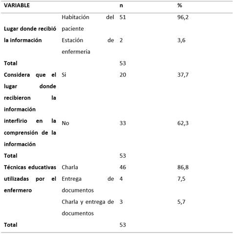 Por otro lado, se encuentra que tanto pacientes como enfermeros consideran que el lugar donde se brinda la educación, en este caso, la habitación del paciente, no interfiere con la comprensión de la misma. Mogollón (8) afirma que el entorno afecta la capacidad para aprender, dado que una de las principales tareas del profesional de enfermería es adecuar el ambiente con el fin de facilitar el aprendizaje, realizando actividades como buscar un área tranquila libre de ruidos para la enseñanza, teniendo en cuenta la comodidad de la habitación, lo cual incluye temperatura, ventilación, iluminación y mobiliario.