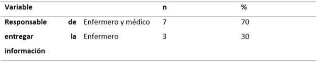 Se evidenció que la responsabilidad de brindar educación no está clara entre los profesionales encontrando que el 70%(n=7) refiere brindar educación a los pacientes con alta hospitalaria durante sus horas de turno y el 30%(n=3) no lo realiza; de ese 30%(n=3) que no lo realiza, el 100%(n=3) refiere que es por falta de tiempo en los horarios de turno; esto se relaciona con la presencia de un solo enfermero por turno , con todos los pacientes del servicio a su responsabilidad y demás tareas de gestión del servicio.