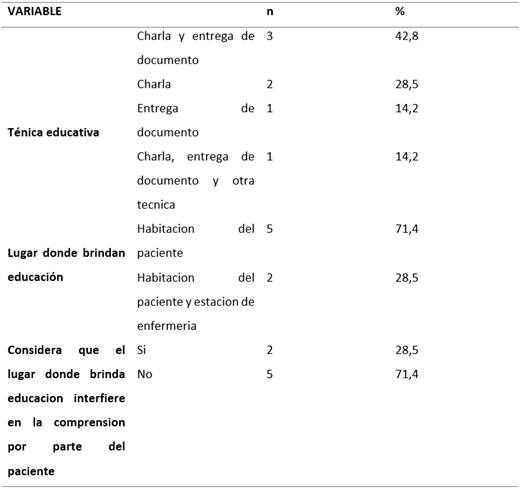 En cuanto a las dificultades referidas en el proceso de brindar educación el 42,8%(n=3) no encontró alguna dificultad, el 28,4%(n=2) mencionó como dificultad el nivel socioeducativo del paciente; el 14,2%(n=1) refirió como dificultad la falta de material estandarizado para patologías y procedimientos y el 14,2%(n=1) la falta de tiempo al brindar la educación. Se considera que el bajo nivel educativo de los pacientes encuestados, posiblemente afecta la interiorización de la información.