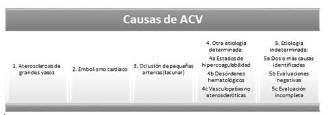 El ACV en un paciente joven, se define como aquella persona entre los 18 y 44 años que cursa con un evento isquémico agudo 6)(7 . Para este grupo de pacientes, se tiende a determinar la etiología, con base en la clasificación del estudio multicéntrico TOAST (Trial of Org 10172 in Acute Stroke Treatment) (Cuadro 1).