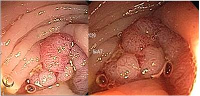 Al examen físico no se encontraron hallazgos de importancia. El paciente presenta estudios previos con evidencia de sangre oculta en heces y Resonancia Magnética (RM); con hallazgos de engrosamiento y edema de la mucosa del colon transverso asociado a cambios inflamatorios leves de la grasa pericólica adyacente. Consideran proceso neoplásico gastrointestinal, razón por la que se solicitó EVDB con hallazgos de lesión tumoral de aspecto maligno en colon descendente (Imagen 1). Valorado por Cirugía general, quienes consideraron ante clínica y hallazgos imagenológicos, hemicolectomía por técnica laparoscópica posterior a marcación tumoral por vía endoscópica.