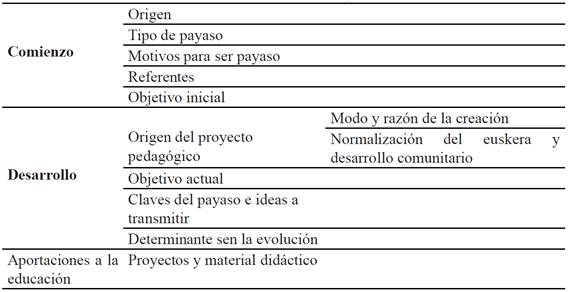 De este modo, el Comienzo, el Desarrollo y las Aportaciones a la educación han sido las metacategorías. En la primera, el Comienzo, se encuentran las categorías de: el origen del grupo de payasos, el tipo de payaso, la razón de elegir ser payaso, los referentes y el objetivo principal. En la segunda, Desarrollo, con el fin de explicar el origen de la creación del proyecto pedagógico, se encuentran dos subcategorías: el modo y la razón de la creación, y la normalización del euskera y el desarrollo comunitario. Otras categorías serían el objetivo actual; las claves del payaso y las ideas que quieren transmitir, así como los determinantes en su evolución. En la tercera y última metacategoría, las Aportaciones a la educación, se encuentran los hallazgos en torno a los proyectos y el material didáctico. Ha sido el sistema categorial el que ha facilitado el análisis y la interpretación de los datos.