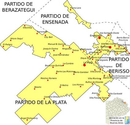 Figura 1 Mapa con el área urbana y las cabeceras de partidos del Gran La Plata (Provincia de Buenos Aires, Argentina).