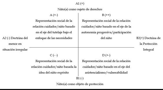 Para la presentación de las consideraciones finales hemos construido una última estructura cruzada que agrupa los resultados más relevantes de nuestro estudio. Como se puede apreciar en la Figura 3, es posible reconocer cuatro Representaciones Sociales que agrupan universos semánticos sobre el estilo de autoridad e interacción que los cuidadores ejercen con los NNA.