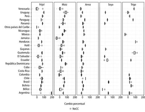 En tercera medida, la evidencia encontrada muestra que los impactos del cambio climático serán específicos por cultivos y países. Resulta notable que el crecimiento de la producción de maíz y frijol caería principalmente en Nicaragua, El Salvador, Guatemala, Honduras, Colombia, Venezuela y Brasil. Por otra parte, a nivel regional la producción de arroz es la que presentaría mayores caídas con respecto al escenario en que no se da el cambio climático (NoCC). Estas reducciones de la producción regional estarían impulsadas por las caídas en el crecimiento de la producción en Brasil, Argentina, Uruguay, Cuba y República Dominicana. En cuanto a la producción de soya, esta se vería afectada de manera importante en Ecuador y Uruguay, mientras que en los demás productores se experimentaría un impacto neutral o positivo. Finalmente, la producción de trigo sería afectada negativamente, especialmente en grandes productores y comercializadores como Argentina, Brasil y Uruguay.